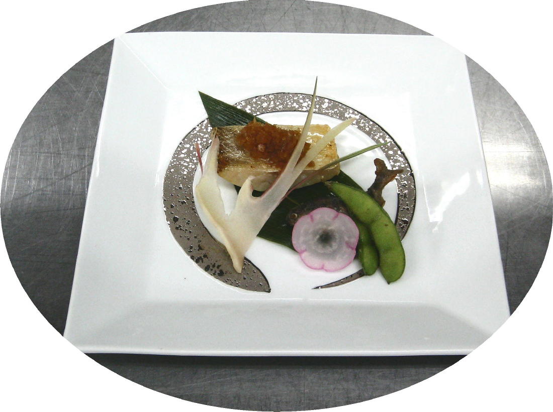 甘鯛の西京焼きの上に 微塵切りにしたラッキョの溜り漬けを載せて有ります。