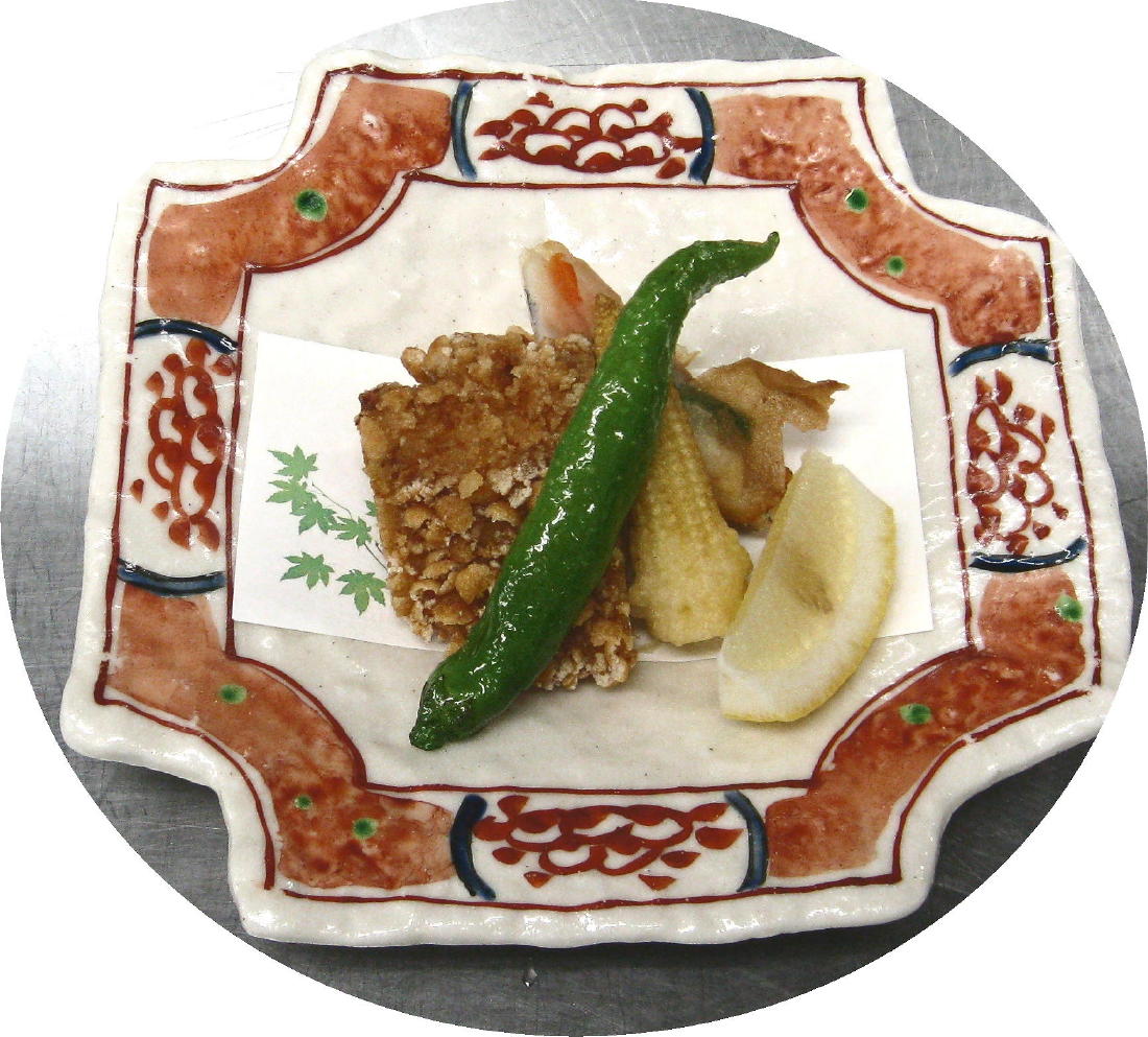 おかき揚げの衣は柿の種を砕いて カマスに付けて有ります。